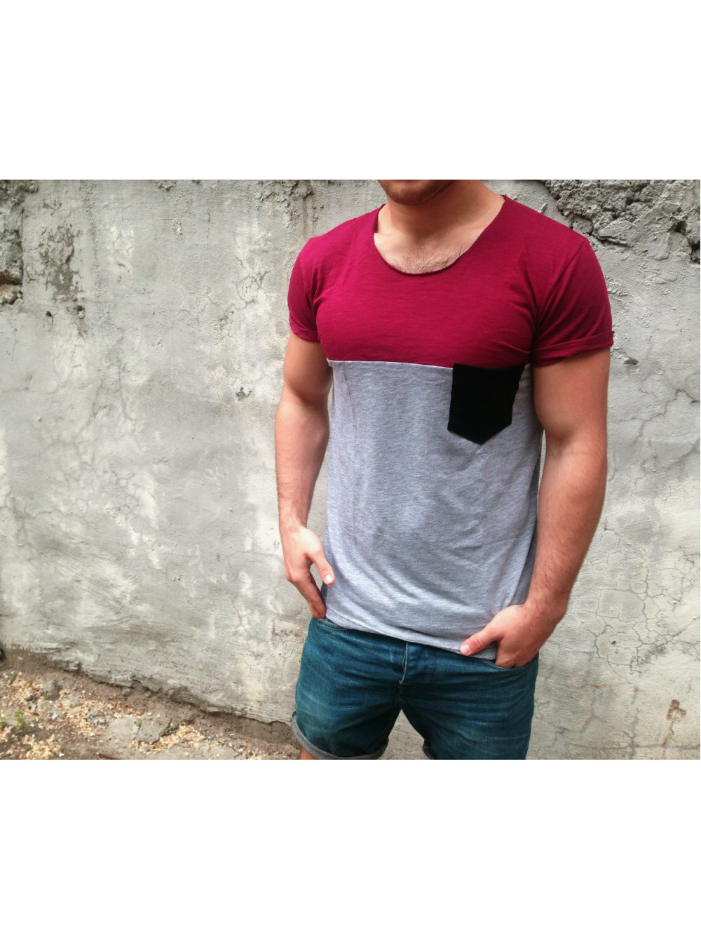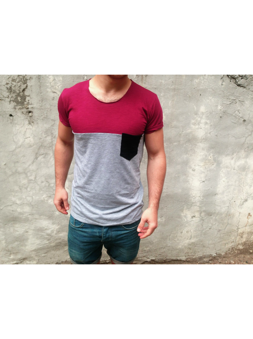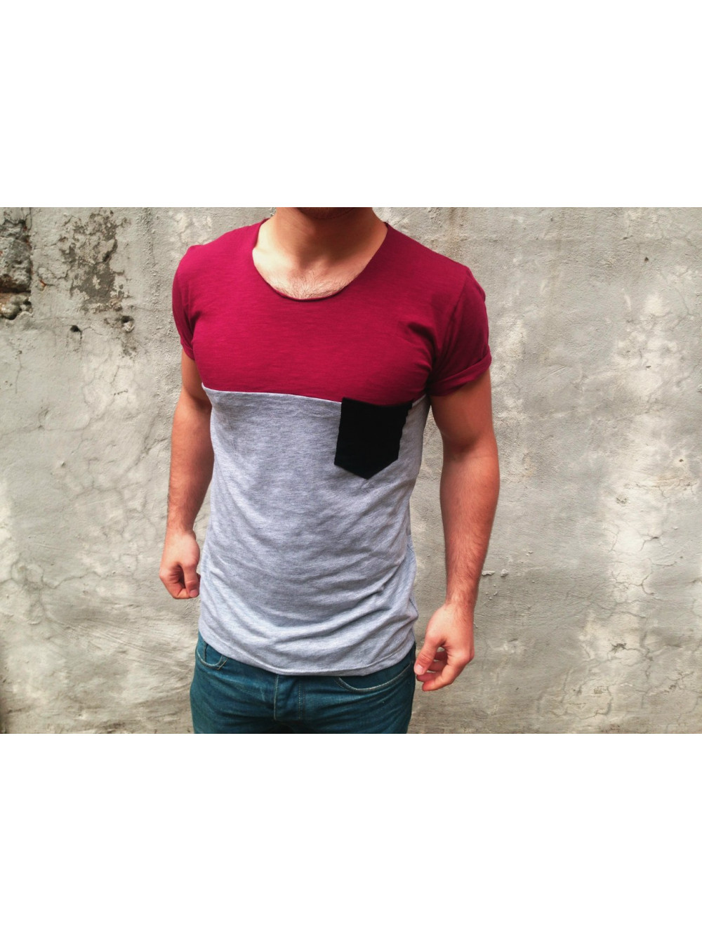 Футболка серая с черным карманом и верхом бордо DC2353